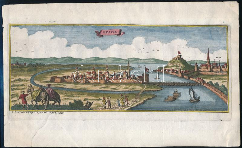 Buda és Pest színezett rézmetszetű látképe a török korból. Középen szószalagon Pesth. A Dunán tutaj és vitorlás hajó, távolabb a hajóhíd. A metszeten törökök korabeli viseletben. A város hátterében a Gellért-hegy rajta a középkori erőd. A város körül a korabeli városfal.