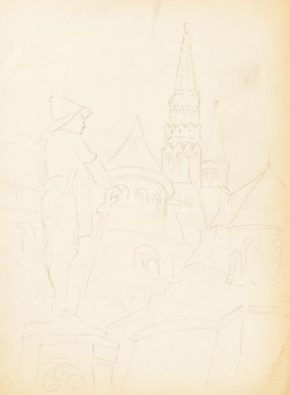 Jelzés nélkül: Mátyás-templom és a Halászbástya, Budapest. Ceruza, papír, jobb alsó sarkában foltos, 30x43 cm