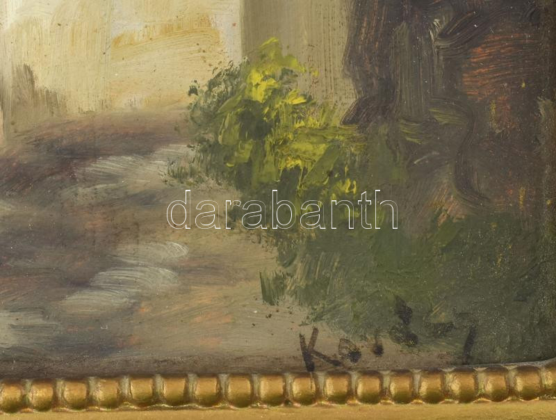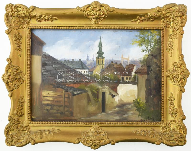 Kardos jelzéssel (Kardos Gábor?): Tabán, Hadnagy utca, háttérben a régi Erzsébet híddal. Olaj, karton. 25X35 cm. Dekoratív fakeretben.