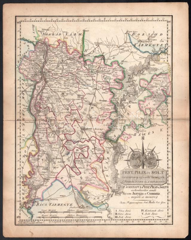 cca 1800 Pest-Pilis-Solt vármegye, a Jászság és a Kunság rézmetszetű térképe. Comitatus Pest Pilis et Solth articulariter uniti: cum Jazygia Cumania Majore et Minore. Antonii Balla színezett rézmetszet, papír, jelzett a dúcon megjelent: Görög Demeter (1760-1833) "Magyar Atlasz azaz a' magyar-, horvát- és tótországi megyék és szabad kerületek földképei", 29x22 cm, hajtva, kis beszakadással a szélén