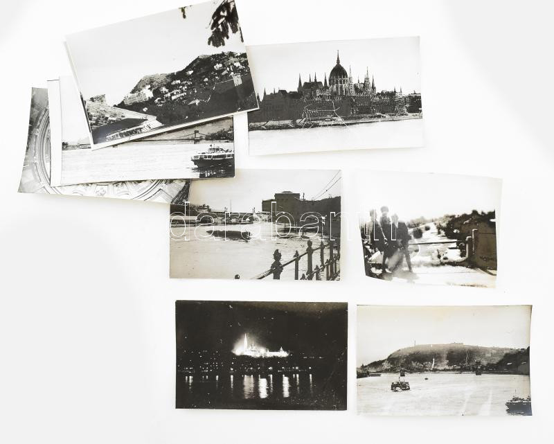 Description: cca 1960 Budapest, Dunapart, városrészletek, egy felvétel az áradó Dunáról háttérben a Lánchíddal, össz. 11 db hátoldalán feliratozott, jelzés nélküli fotó, 9x14 cm