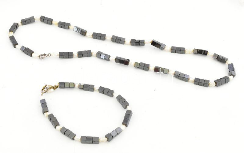 Hematit és tenyésztett gyöngy nyaklánc és karkötő szett, ezüst (Ag) kapoccsal, h: 44 cm és 19 cm