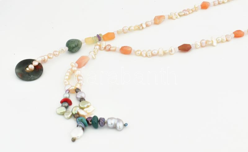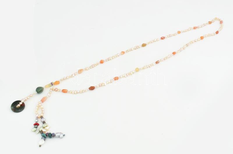 Hosszú tenyésztett gyöngy és achát nyaklánc, kb. 135 cm