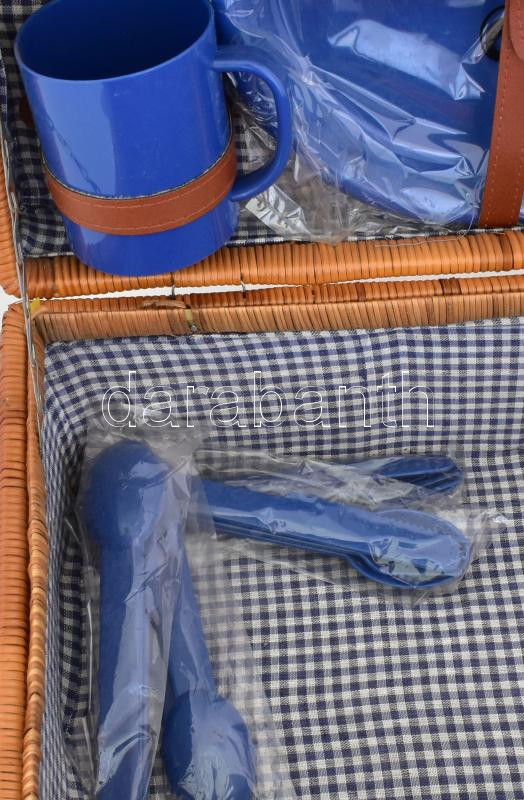 Piknik kosár, rattan, műanyag evőeszközökkel, jó állapotban, 45x30x20 ...