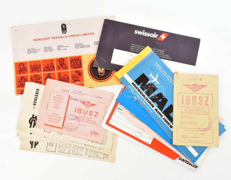 14 db utazási jegy és tájékoztató (MALÉV, IBUSZ, Swissair, stb.)