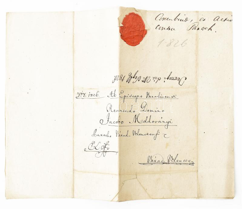1826 Vurum József (1763- 1838) nagyváradi püspök levele, autográf aláírással, Moldoványi Jakab váradvelencei plébános részére, töredezett viaszpecséttel, hajtott.