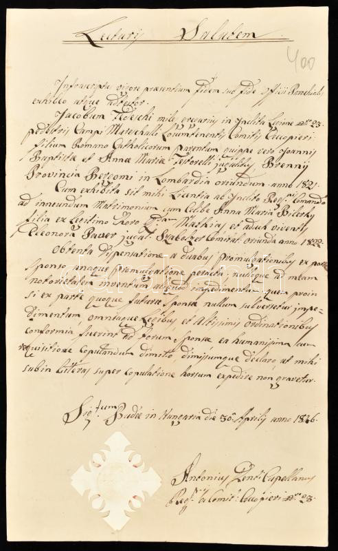 1846 Latin nyelvű okmány papírfelzetes pecséttel.