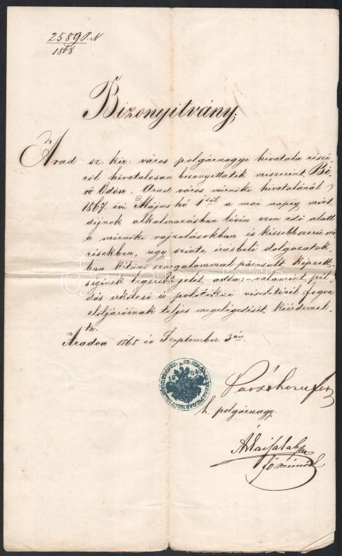1868 Arad, a városi polgárnagyi hivatal által kiállított munkáltatói i... https://www.darabanth.com/en/457-Online-auction/457.0/Art-and-other-collectibles/Documents~500025/1868-Arad-a-varosi-polgarnagyi-hivatal-altal-kiallitott-munkaltatoi-igazolaserkolcsi-bizo~II3054859