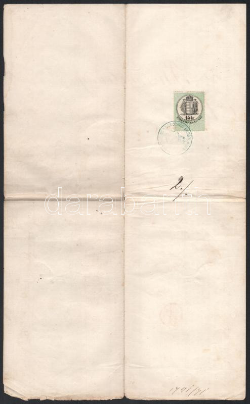 Description: 1868 Arad, a városi polgárnagyi hivatal által kiállított munkáltatói igazolás/erkölcsi bizonyítvány Biró Ödön mérnök részére, aláírásokkal, bélyegzővel, hátoldalán 15kr okmánybélyeggel. Hajtva, a hajtás mentén kisebb szakadással.