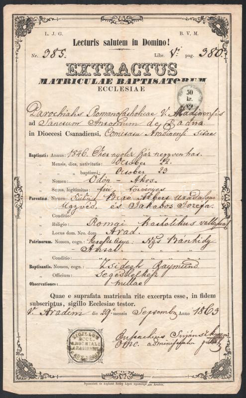 1869 Arad, születési anyakönyvi kivonat/keresztlevél, rajta Sujánszky Euszták (1811-1875) minorita-rendi szerzetes, házfőnök aláírásával (jelen volt az aradi vértanúk kivégzésénél 1849. október 6-án), 50kr okmánybélyeggel, 33,5x21 cm