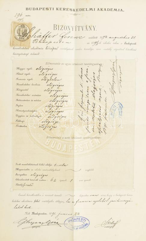 1891 A Budapesti Kereskedelmi Akadémia végbizonyítványa okmánybélyegge...