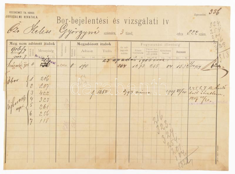 1906-1907 Bor-bejelentési és vizsgálati ív, Kecskeméti Th. Város javadalmi hivatal, hajtott, foltos.