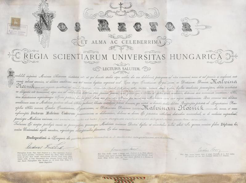 1911 Hornik Malvin (1887-1975) orvos, fül-orr-gégész, rendelÅ‘intézeti fÅ‘orvos, Hollán Henrik (1882-1971) orvos, kórháztörténész feleségének doktori diplomája, pergamen, Budapesti Tudományegyetem (ELTE), Fröhlich Izidor elméleti fizikus, rektor, Tangl Ferenc fiziológus, humán és állatorvos, dékán, Hoór Károly orvos, szemész, aláÃrásaival, fatokos függÅ‘pecséttel, a pergamen háta foltos.