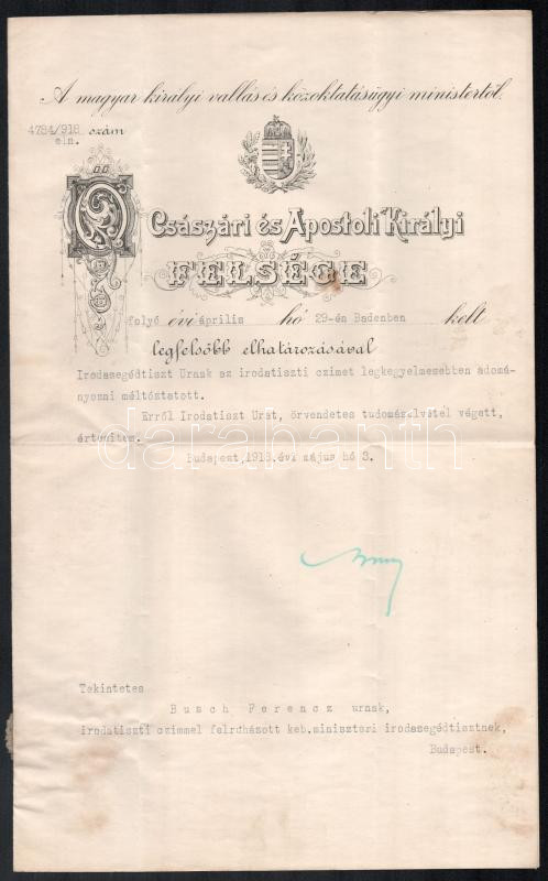 Description: 1918 1918 Apponyi Albert (1846-1933) vallás- és közoktatásügyi miniszter (3. Wekerle-kormány, 1917. aug. 23. - 1918. máj. 8.), politikus, országgyűlési képviselő aláírása egy kinevezésen, a vallás- és közoktatásügyi miniszter fejléces papírján, 1918. május. 3. , foltos.