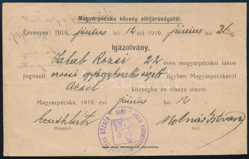 1919 június Igazolvány Magyarpécskáról Aradra utazás jogosultságáról, ...