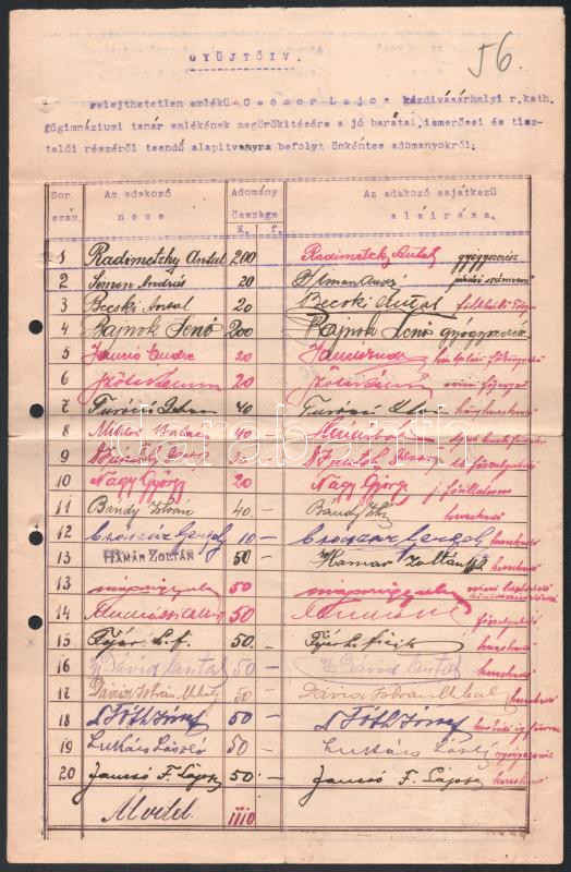 1921 Gyűjtőív Csömör Lajos kézdivásárhelyi r. kath. főgimnáziumi tanár emlékének megörökítésére (alapítvány létesítésére), sok aláírással