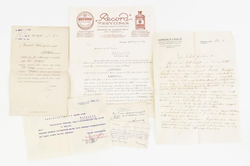 1922-1943 Szmodics Lászlónak címzett üzleti levelek, általa megírt névjegykártyák, tartozásokkal és váltokkal kapcsolatos ügyekben, össz. 6 db