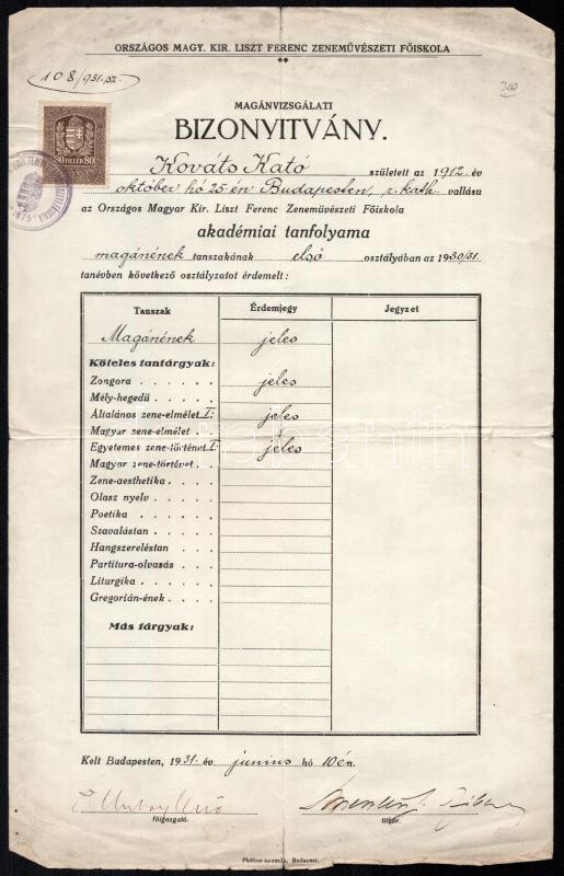 Description: 1931-1934 Hubay Jenő (1858-1937) hegedűművész, az Országos Magyar Kir. Liszt Ferenc Zeneművészeti főiskola igazgatójának aláírásai a főiskola 3 bizonyítványán.