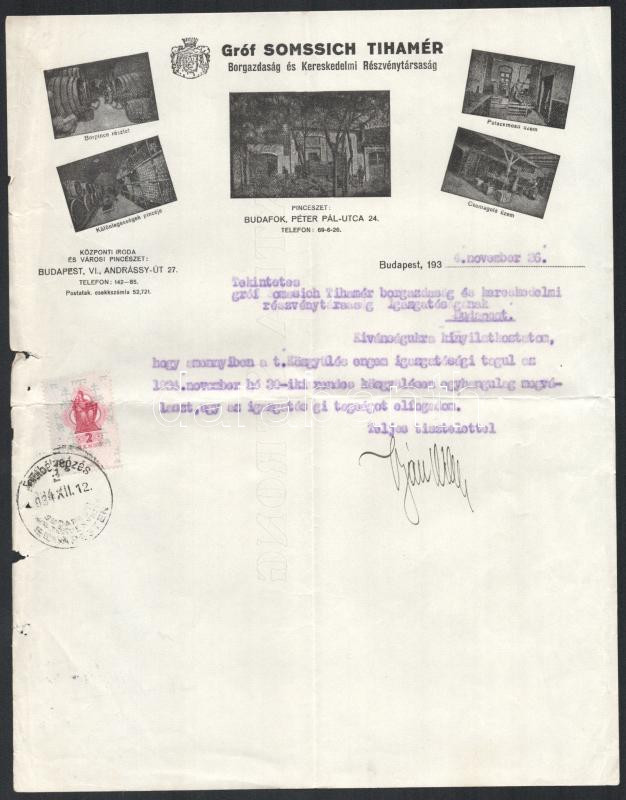 1934 Bp., Gróf Somssich Tihamér Borgazdaság és Kereskedelmi Rt. (pincé... https://www.darabanth.com/en/457-Online-auction/457.0/Art-and-other-collectibles/Documents~500025/1934-Bp-Grof-Somssich-Tihamer-Borgazdasag-es-Kereskedelmi-Rt-pinceszet-Budafok-Peter-Pa~II3055099