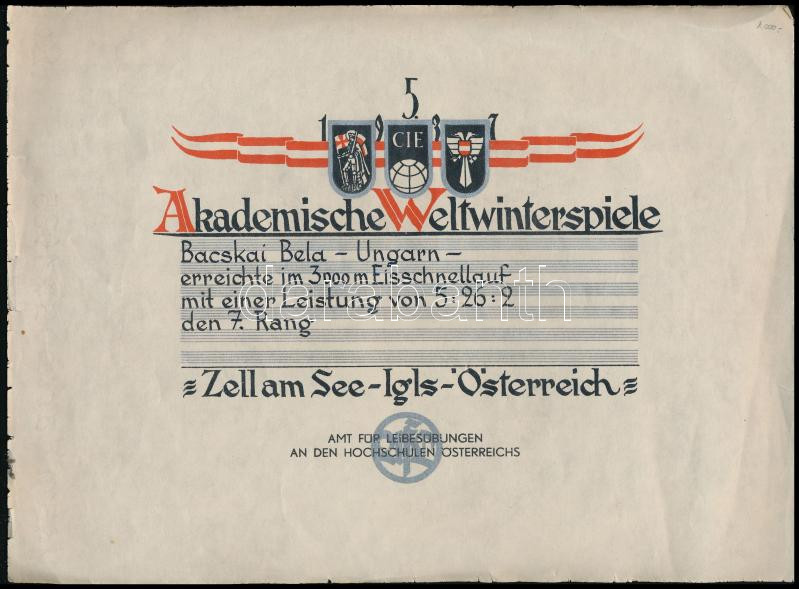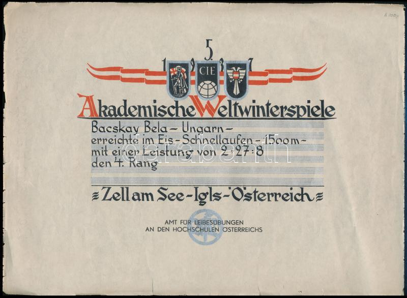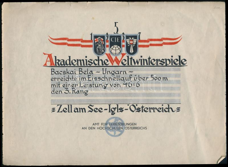 1937 Bácskai Béla (1912-1994) gyorskorcsolyázó részére szóló 3 db emléklap (Akademische Weltwinterspile), közte szakadt.