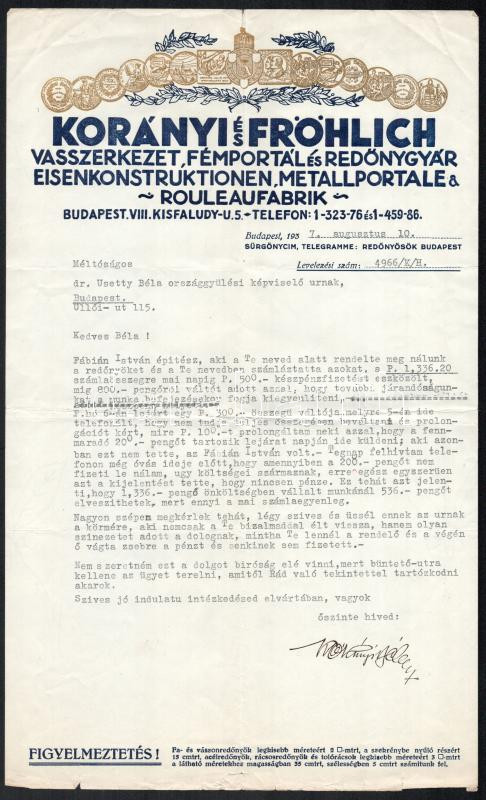 1937 Korányi és Fröhlich vasszerkezet, fémportál és redőnygyár díszes ... https://www.darabanth.com/en/457-Online-auction/457.0/Art-and-other-collectibles/Documents~500025/1937-Koranyi-es-Frohlich-vasszerkezet-femportal-es-redonygyar-diszes-fejleces-levele-Uset~II3062611