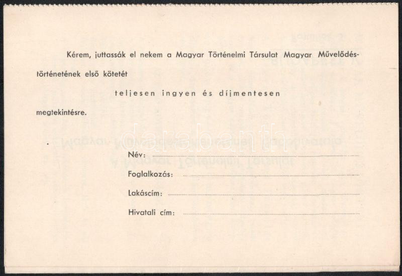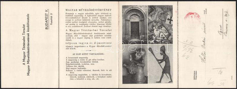 1939 Magyar Művelődéstörténet megrendelőlapja, postázott, nyomtatott a...