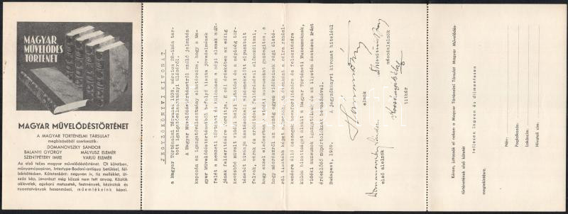 1939 Magyar Művelődéstörténet megrendelőlapja, postázott, nyomtatott aláírásokkal.