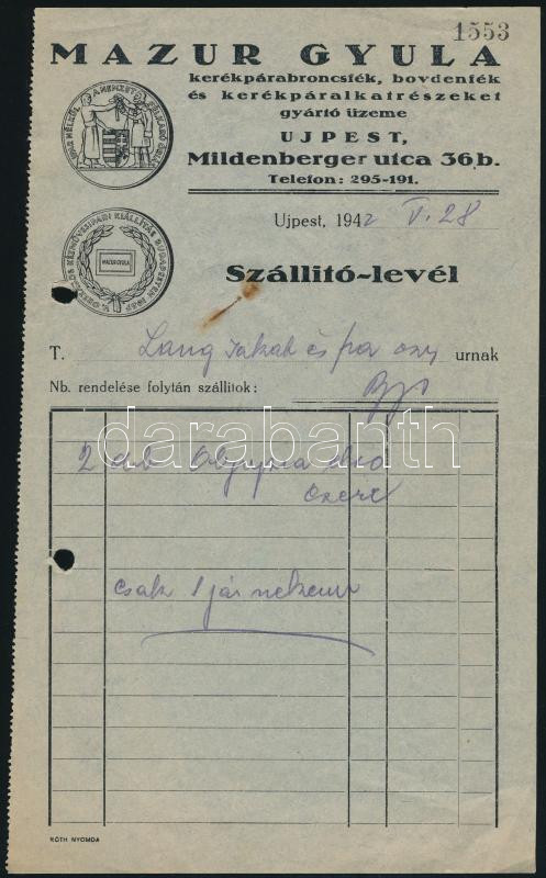 1942 Újpest, Mazur Gyula kerékpárabroncskép, bovdenfék stb. üzemének fejléces szállítólevele