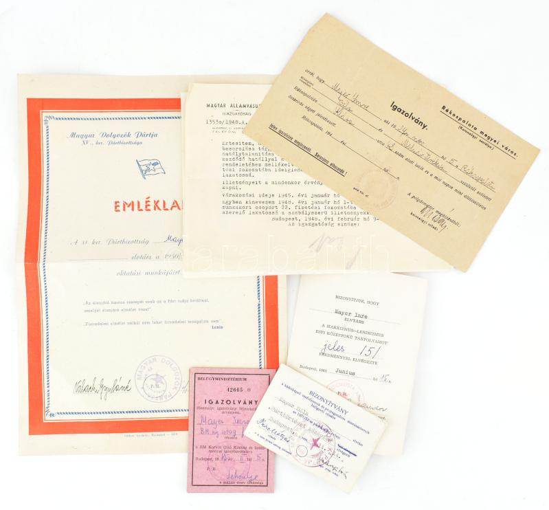 1948-1985 Szocialista iratok, emléklapok, össz. 7 db, közte Magyar Dolgozók Pártja Államvédelmi Hatóság Pártszervezete által kiállított bizonyítvány "Párttörténet középfok" tanfolyam elvégzéséről, Belügyminisztérium Korvin Ottó Kórház intézményeinek igénybevételére jogosító igazolvány, MDP választási agitációs és oktatási munkáért kiállított emléklapok, stb.