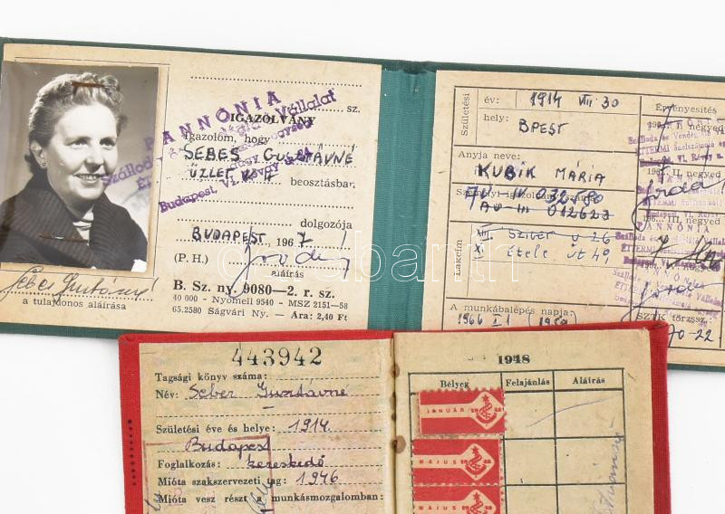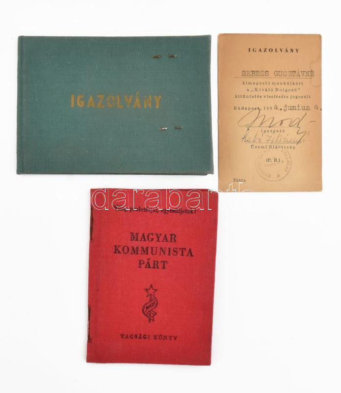 1948-64 Sebes Gusztávné, Sebes Gusztáv, az Aranycsapat szövetségi kapitánya feleségének 3 db okmánya: MKP tagsági könyv, fényképes igazolvány és "Kiváló Dolgozó" kitüntetés viselésére jogosÃtó igazolvány