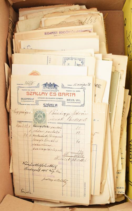 Egy nagy doboznyi papírrégiség, benne sok okmánybélyeges irat, fejléces számla, stb
