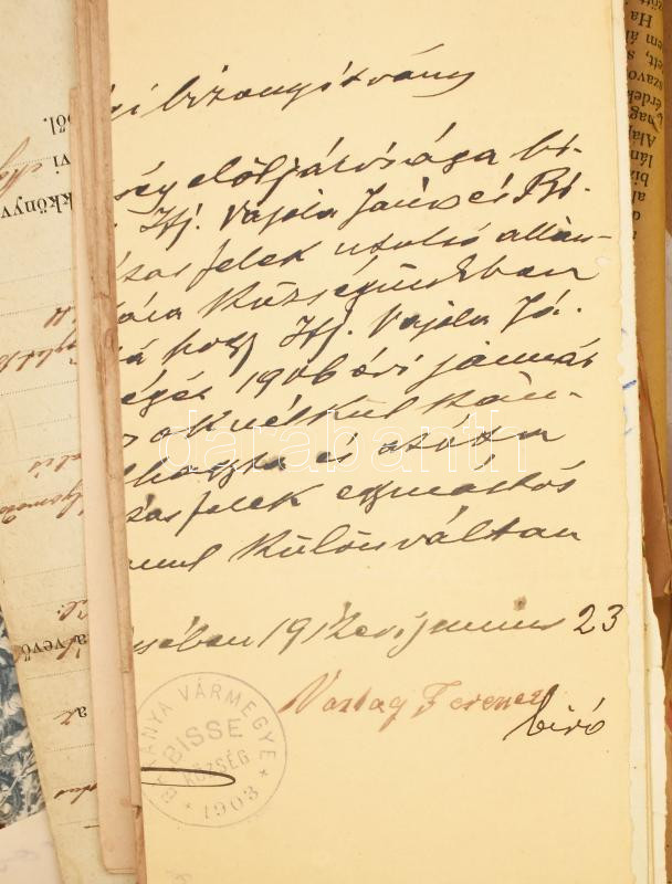 Egy nagy doboznyi papírrégiség, benne sok okmánybélyeges irat, fejléce...