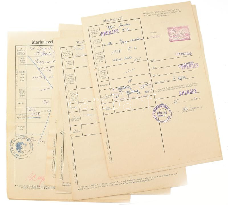 cca 1961-196 6 db hódmezővásárhelyi marhalevél, díjjegyes okmányok különböző címletűek, okmánybélyeggel