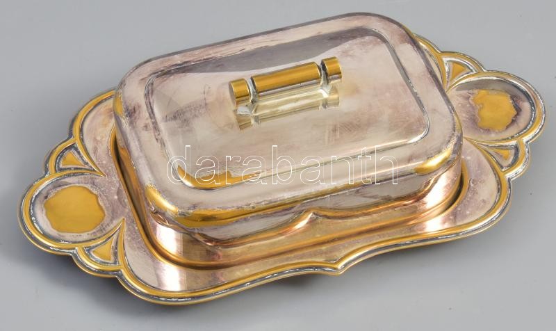 Ezüstözött fém vajtartó, üvegbetéttel, jelzett, kopásnyomokkal, 20×11 ...
