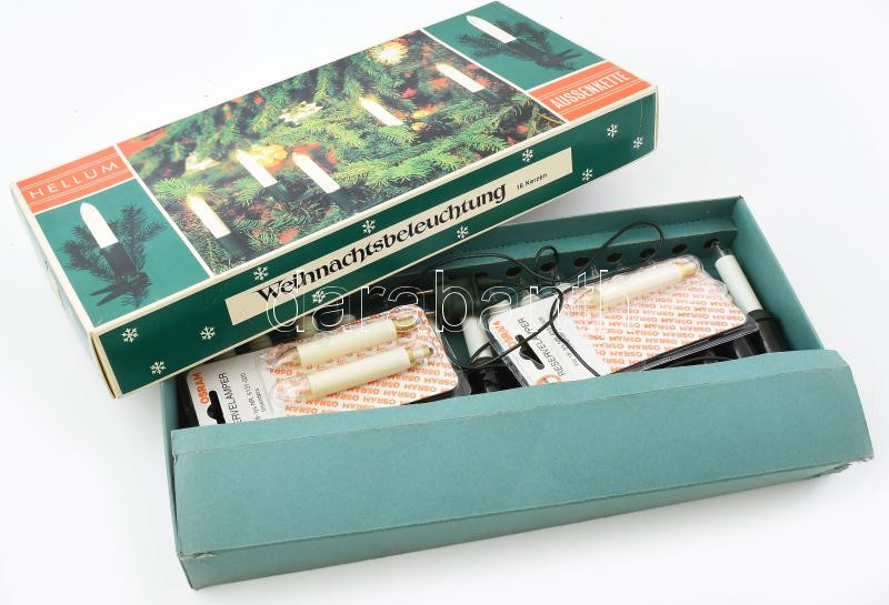 Karácsonyi égőfüzér, 16 db gyertyaégővel (+3 db tartalék), néhány csíptető sérült, eredeti dobozában.