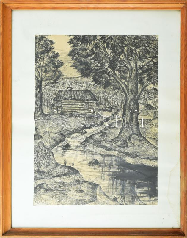 Olvashatatlan jelzéssel: Házikó a patak mentén. Tus, papír. Üvegezett ...