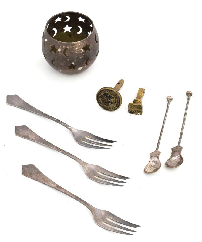 Össz. 8 db fémtárgy: 2 db antik réz pecsétnyomó, az egyik "Sigil Parochiae Mihaliensis 1820" felirattal + 3 db Sandrik jelzett alpakka villa + 2 db monogramos ezüstözött kanál + mécsestartó. Vegyes méretben és állapotban.