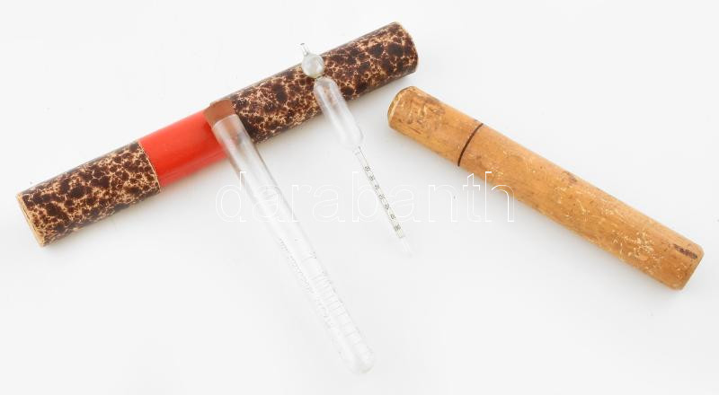 Régi Ultzmann-féle fajsúlymérő, és kémcső, tokban, m 13,5 cm, m: 17 cm