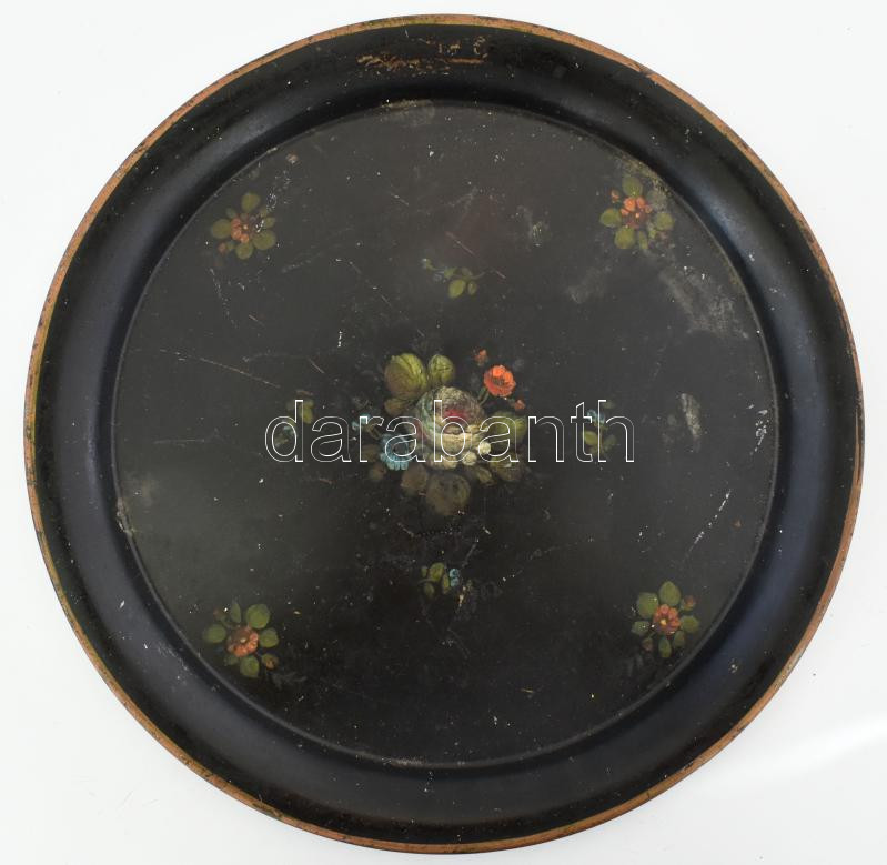 Régi francia festett virágmintás fémtálca, kopással, jelzéssel, d: 39 ...