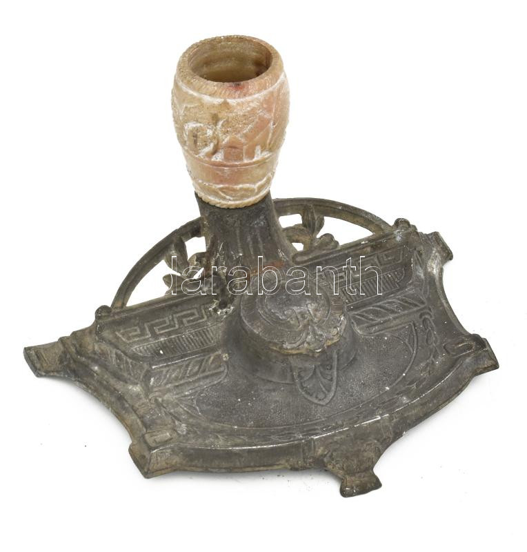 Szecessziós ón kalamáris, üvegbetét nélkül, faragott kő felső résszel ...