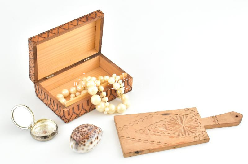 Vegyes bolha tétel, fadoboz, kagyló, gyöngy, vegyes állapot
