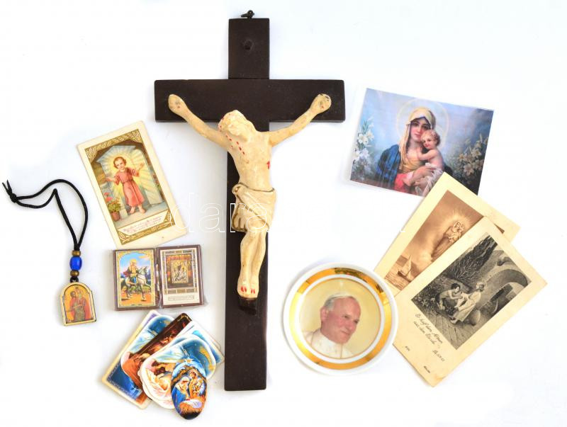 Vegyes kegytárgyak, közte feszület, Hollóházi porcelán tálka, kártyák, stb