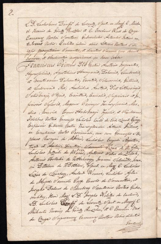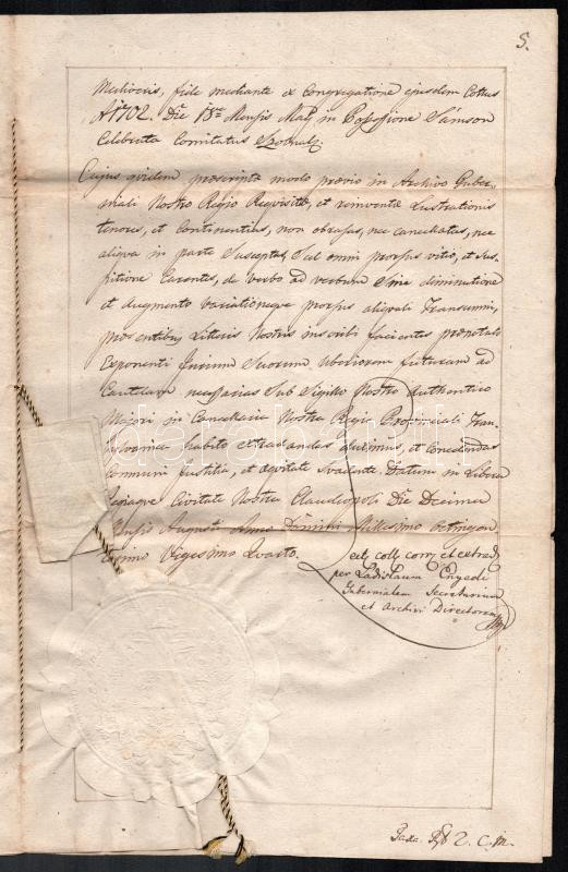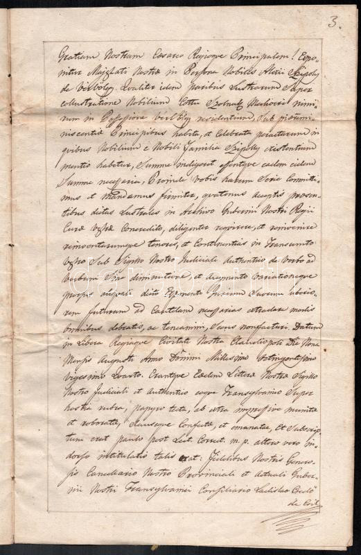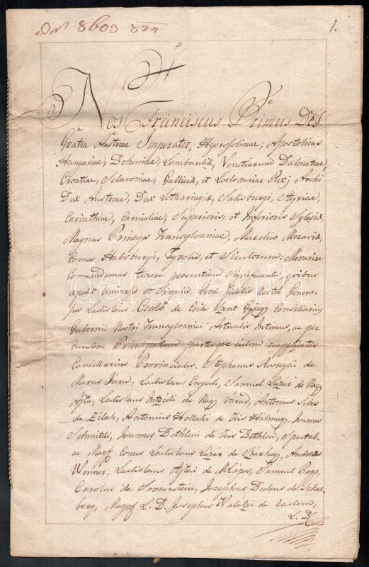 1824 Az erdélyi, Szilágy megyei Vérvölgy falu tárgyában. I. Ferenc császár nevében kiadott erdélyi kormányzósági rendelet Enyedi László, kormányszéki fogalmazó aláírásával és császári papírfelzetes viaszpecséttel öt beírt oldalon. /