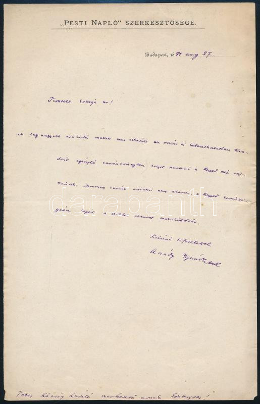 Description: 1887 Bp., Acsády Ignác (1845-1906) történész, újságíró levele Kőrösy László (1856-1918) esztergomi bölcseleti doktor és főreáliskolai tanárnak, 1 kézzel írt oldal, Acsády Ignác autográf aláírásával, Pesti Napló fejléces papírján