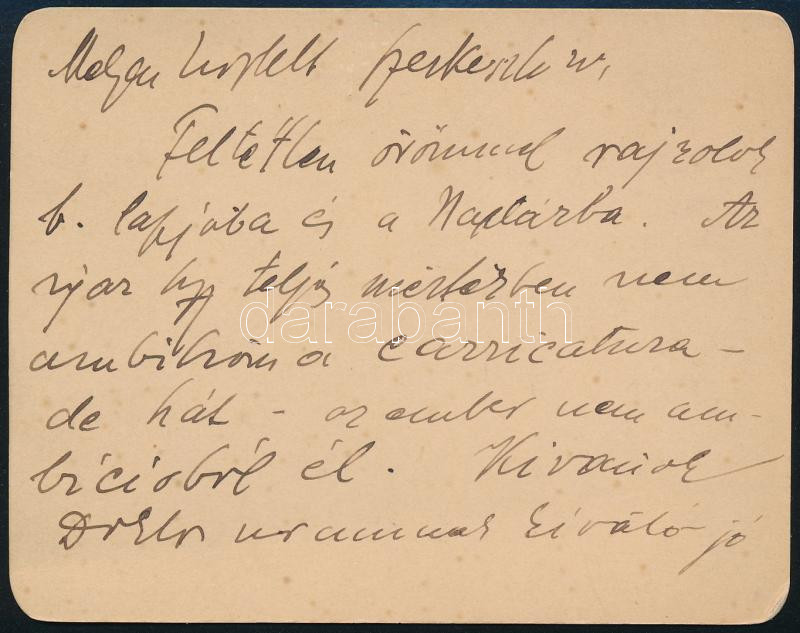 1894 Márk Lajos (1867-1940) festőművész autográf sorai kártyán, Ágai Adolf (1836-1916) humorista, a Borsszem Jankó szerkesztője részére. "Feltétlen örömmel rajzolok b. lapjába és a naptárba." Autográf aláírással, 2 beírt oldal, 9x11 cm
