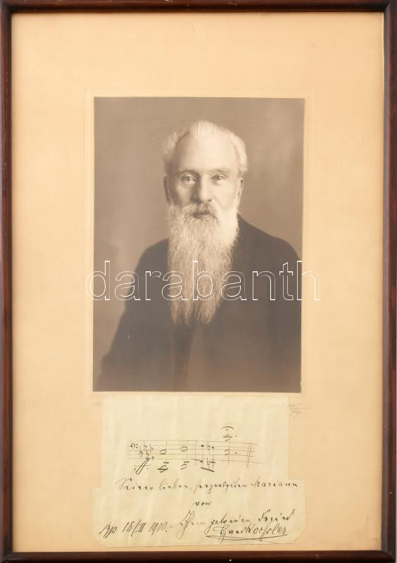 1900-1927 Hans Koessler/Koessler János (1853-1926) zeneszerző, zenepedagógus, karnagy, orgonista saját kezű sorai, kotta részlettel, autográf aláírással, dátumozva, papírlapon egy őt ábrázoló nagyméretű fotó kartonjára ragasztva, üvegezett keretben, fotó: 23x17 cm, keret: 45x32 cm Koessler János akadémiai zenetanárként számos neves zenész, zeneszerző mestere volt, közte: Bartók Béla, Kodály Zoltán, Dohnányi Ernő, Kálmán Imre, Weiner Leó.