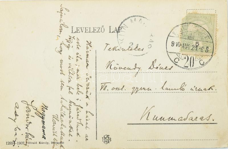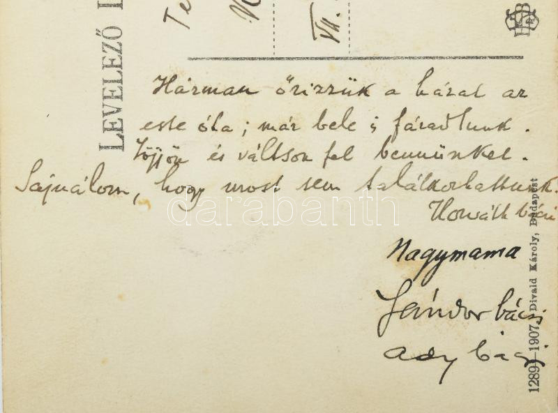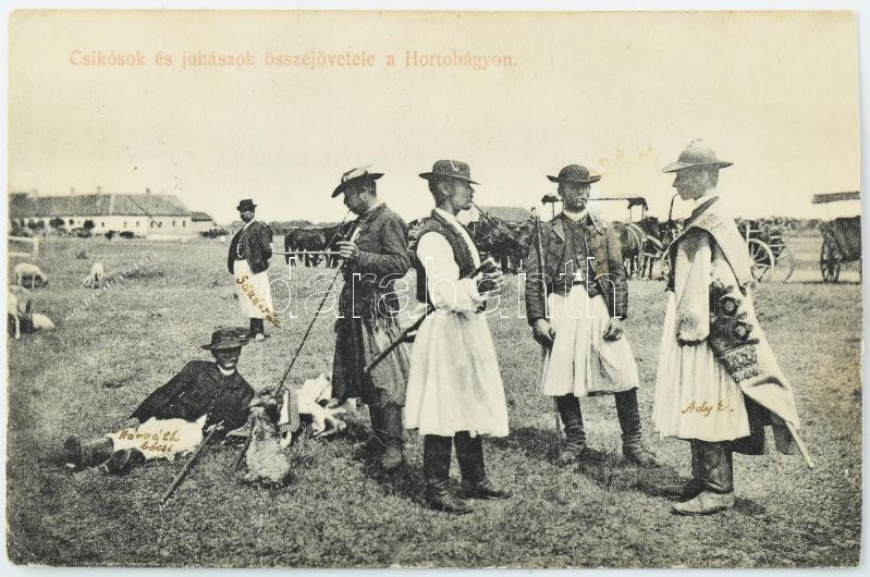 1910 Ady Endre (1877-1919) - Horváth János (1878-1961) - Szilágyi Sándor (?-?) klasszika filológus által küldött lap: "Hárman Å‘rizzük a házat az este óta, már bele is fáradtunk. Jöjjön és váltson fel bennünket. Sajnálom, hogy most nem találkozhattunk. Horváth bácsi. Nagymama. Sándor bácsi. Ady bácsi."..."Kövendy Dénes VII. oszt. gym. tanuló úrnak." 1910. aug. 31., Kunmadaras. Horváth János (1878-1961) irodalomtörténész autográf soraival és aláÃrásával, valamint Szilágyi Sándor klasszika filológus és Ady Endre (1877-1919) költÅ‘, Ãró, újságÃró autográf aláÃrásaival. Valamint a képeslap másik oldalán a csikósok gatyáján ugyancsak az Å‘ aláÃrásaikkal. Horváth Jánost irodalomtörténészt, kritikust Szilágyi Sándor klasszika filológus mutatta be Ady Endrének, valószÃnűleg 1909. decemberében. Szilágyi Eötvös-kollégistaként Horváth János barátja volt, késÅ‘bb Ady Lajossal is együtt tanÃtott. Ady és Horváth együtt mentek Szilágyihoz Debrecenbe, majd a Hortobágyra is. Innen küldtek lapot, az akkor még fiatal Kövendi Dénesnek (1894-1965) késÅ‘bbi klasszika-filológusnak és tréfásan a csikósok gatyájára Ãrták fel a nevüket.