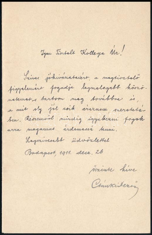 1911 Csánki Dezső (1857-1933) főlevéltárnok, történész, művelődéspolitikus, MTA tag köszönő levele ismeretlennek, 1 kézzel írt oldal, Csánki Dezső autográf aláírásával