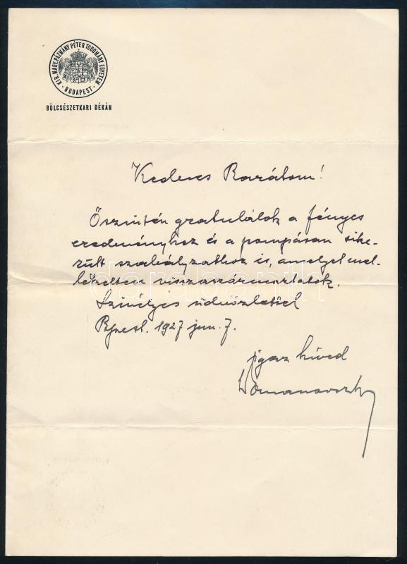 1927 Domanovszky Sándor (1877-1955) történész, Kir. M. Pázmány Péter Tudományegyetem dékánjának gratuláló levele ismeretlennek, egy kézzel Ãrt oldal, Domanovszky Sándor autográf aláÃrásával, dékáni fejléces papÃron