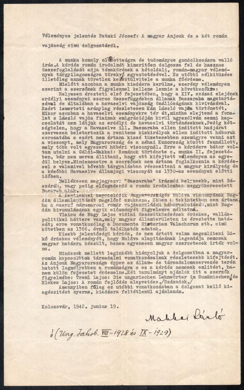 Description: 1942 Kolozsvár, Makkai László (1914-1989) történész, egyetemi tanár véleményes jelentése Pataki József: A magyar Anjouk és a két román vajdaság c. dolgozatáról. egy géppel írt oldal, Makkai László autográf aláírásával